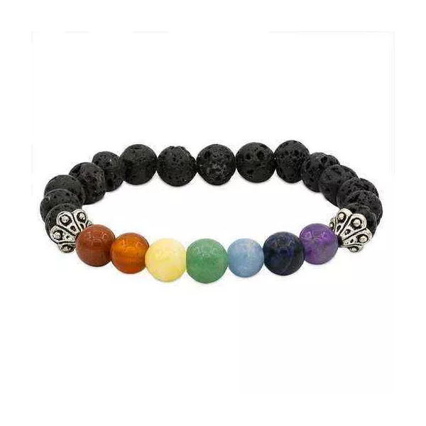 Braccialetto elastico in Roccia lavica, con una pietra per ciascuno dei 7 Chakra: Granato, Corniola, Avventurina gialla, Avventurina verde, Turchese, Sodalite, Ametista.